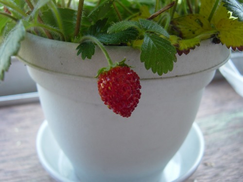 なんと、窓辺に置いてるワイルドストロベリーの実が赤く色付いているではありませんか