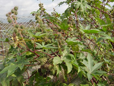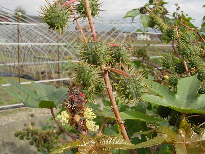 種子を絞って油が取れます。それを蓖麻子油(ヒマシ油)と言います。下剤・印刷インクなどに使われるそうです。でも、種子には毒があるそうなので食べないように!