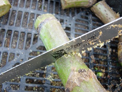 ノコギリで切断中、木化した部分はノコギリでないと切れません。この作業後、筋肉痛になりました・・・兄が(笑)